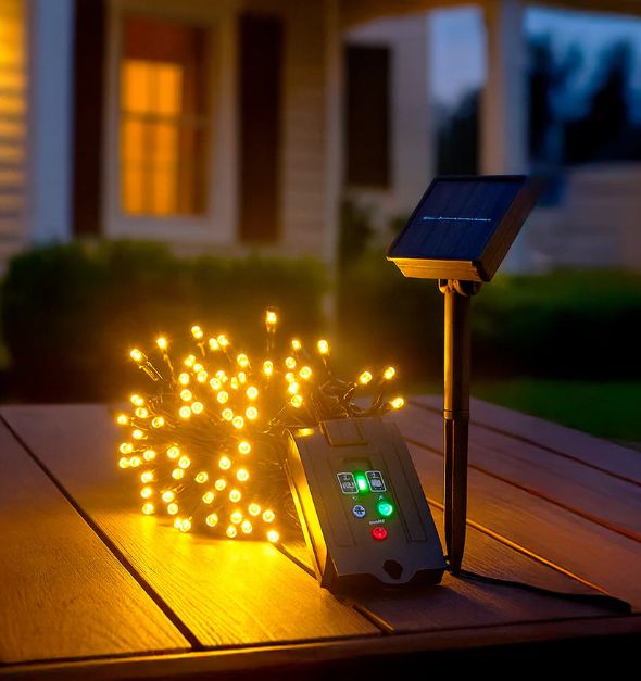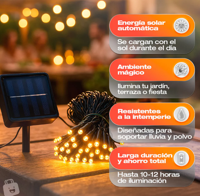 Con nuestras Luces Navideñas Solares, tus espacios se llenarán de alegría y luz sin preocuparte por cables o enchufes. ¡Solo colócalas y deja que el sol haga su trabajo!