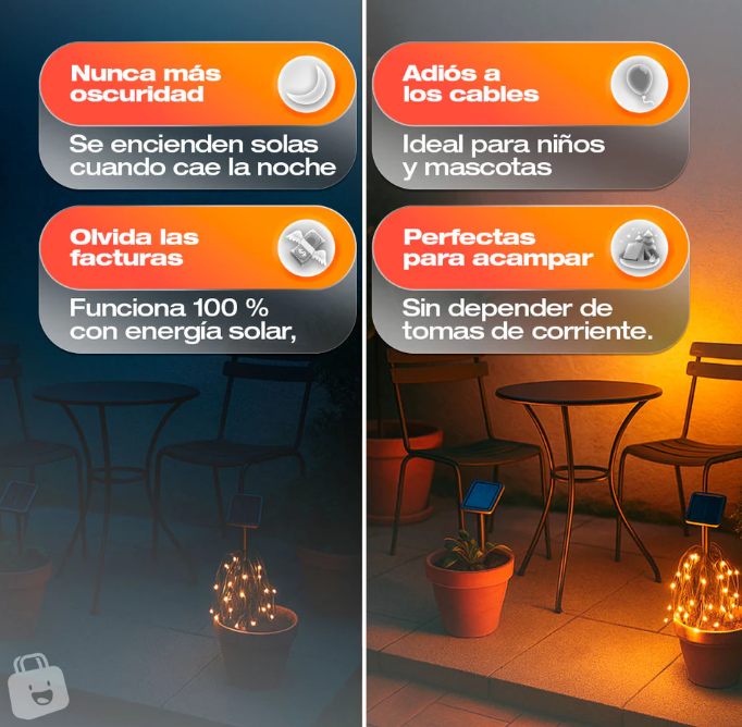 Imagina llegar a casa y ver tu jardín o balcón lleno de luz cálida, creando un ambiente acogedor y festivo sin usar energía eléctrica.
