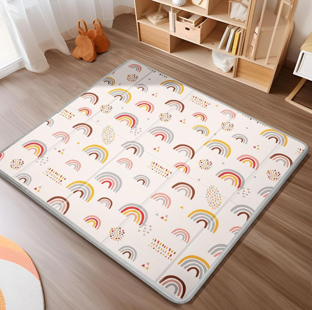 • Diseño reversible: Un lado con figuras coloridas que estimulan la curiosidad, y otro minimalista en gris neutro que combina con cualquier estilo de hogar.